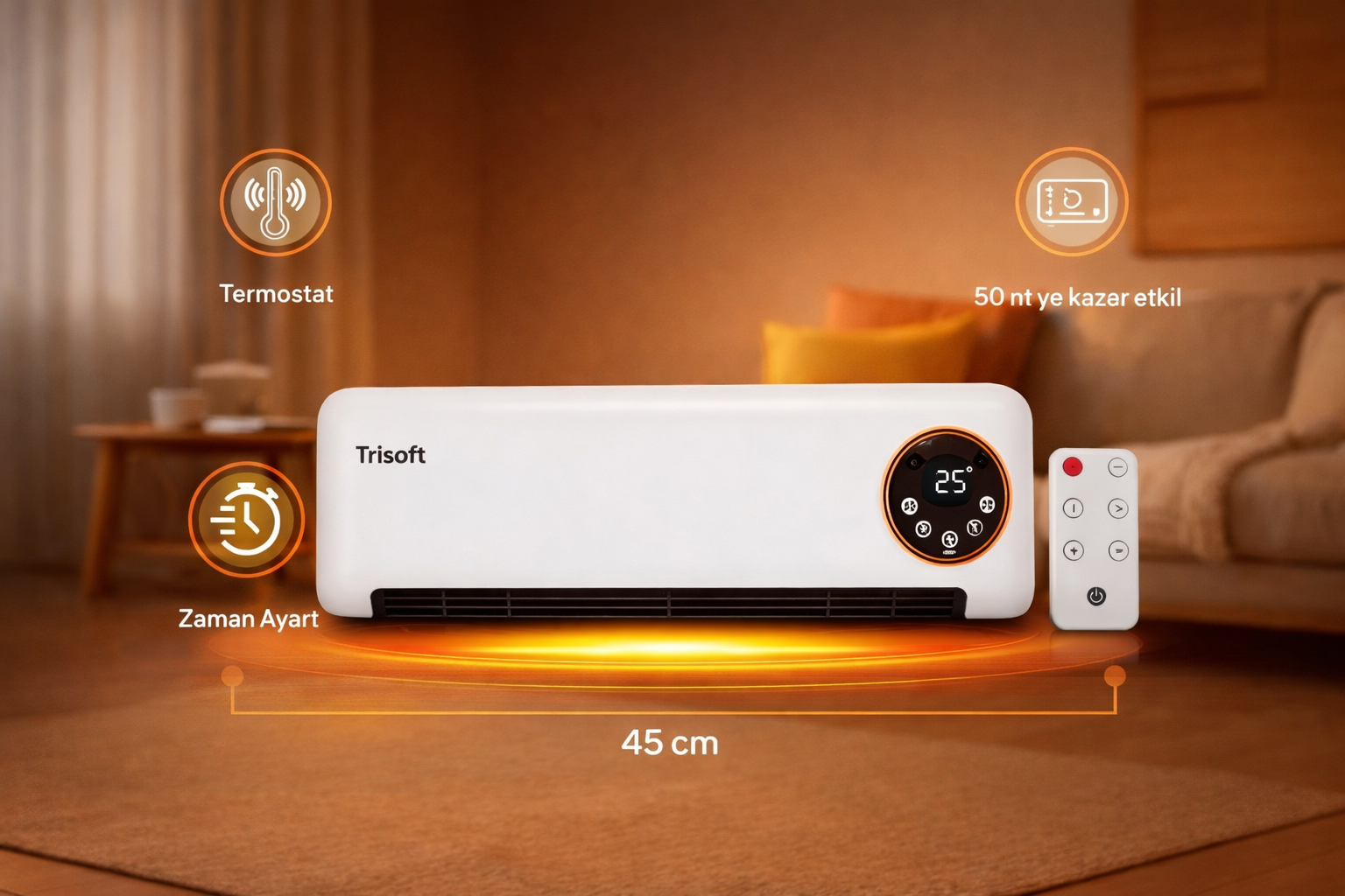 Trisoftu prize takın, uzaktan kumandadan istediğiniz sıcaklığı seçin ve birkaç dakika içinde ortamın ısındığını hissedin.